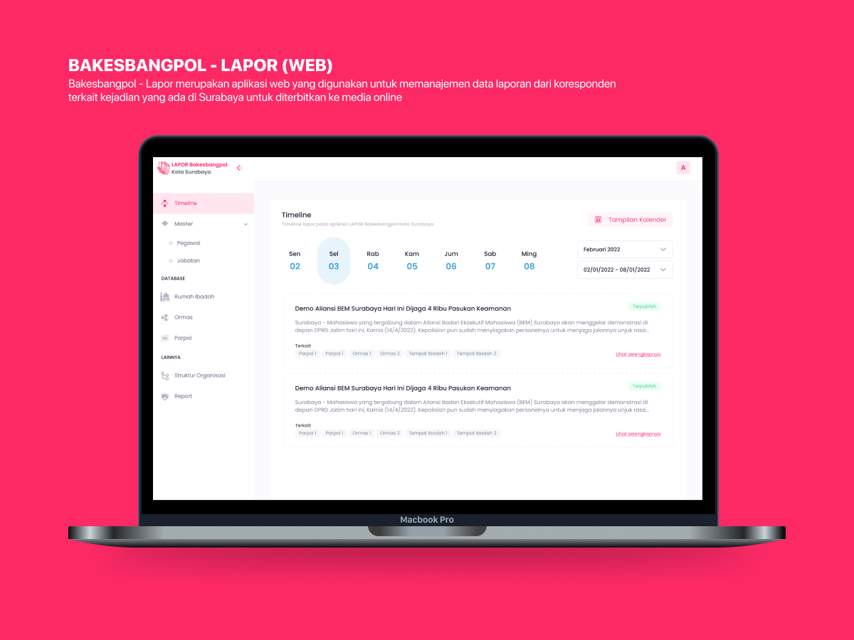 Bakesbangpol – Lapor merupakan aplikasi web yang digunakan untuk memanajemen data laporan dari koresponden terkait kejadian yang ada di Surabaya untuk diterbitkan ke media online
